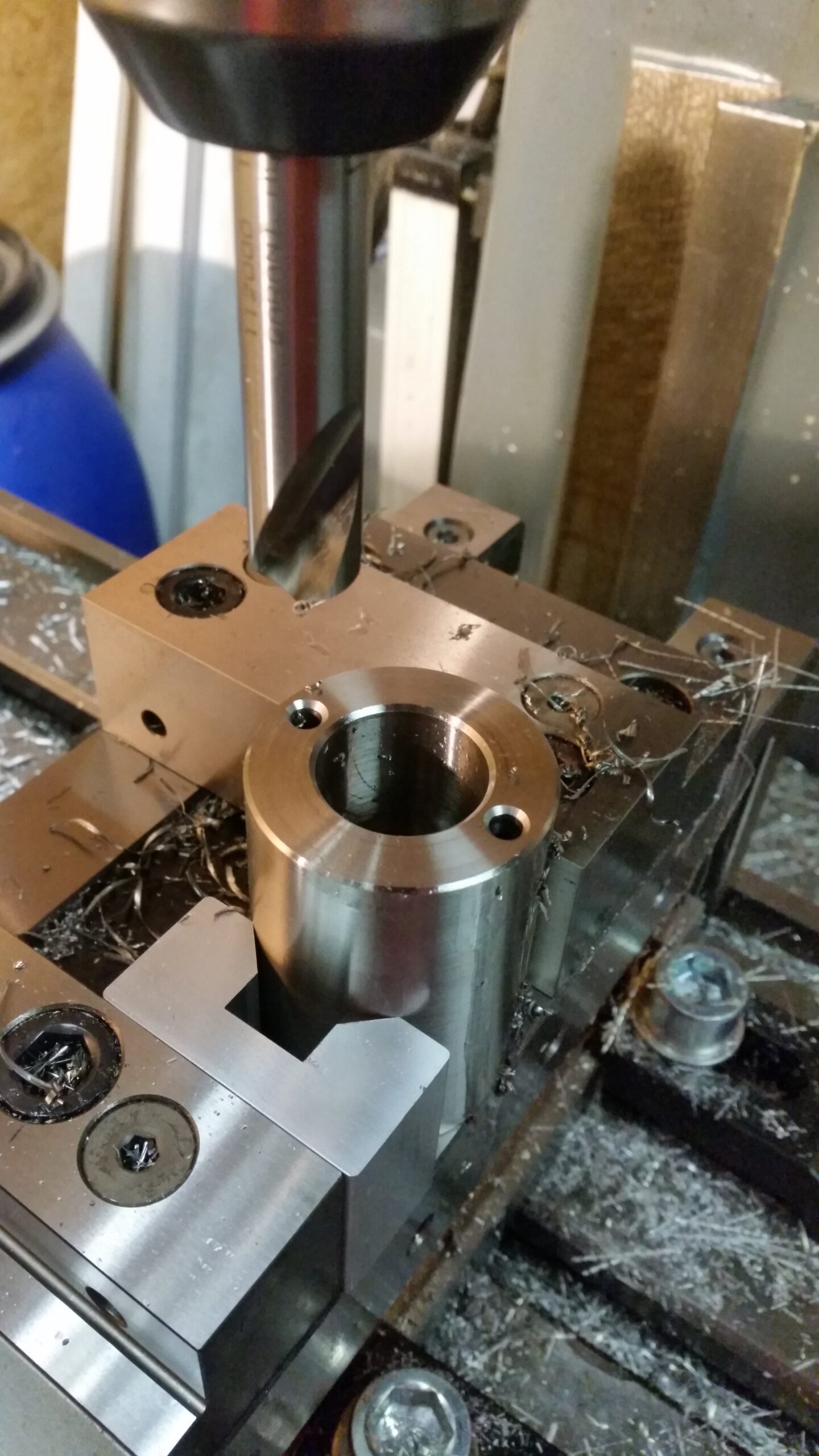 Als erstes Projekt wurde ein Platte aus AW-7075 Aluminium plangefräst und dann Sitze für Kugellager ausgespindelt: