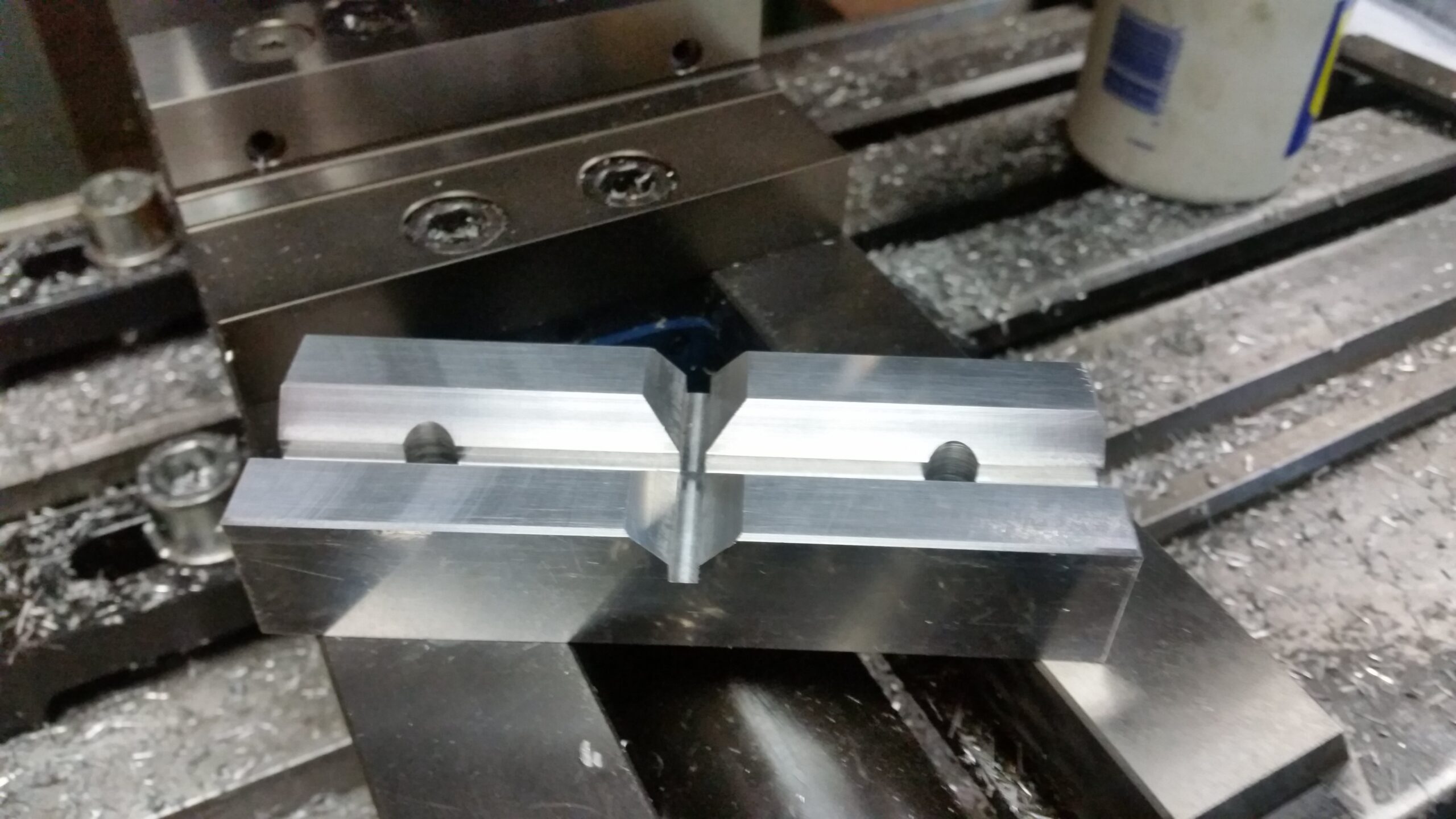 So haben wir direkt mal aus Aluminium-Reststücken zwei Soft-Jaws gefräst, um auch rundes Material halten zu können. Zuerst mit einem 16mm VHM Fräser Vollnut durch die Mitte und abschließend mit einem 16mm HSS 45° Fasenschneider noch die entstandenen Ecken angefast: