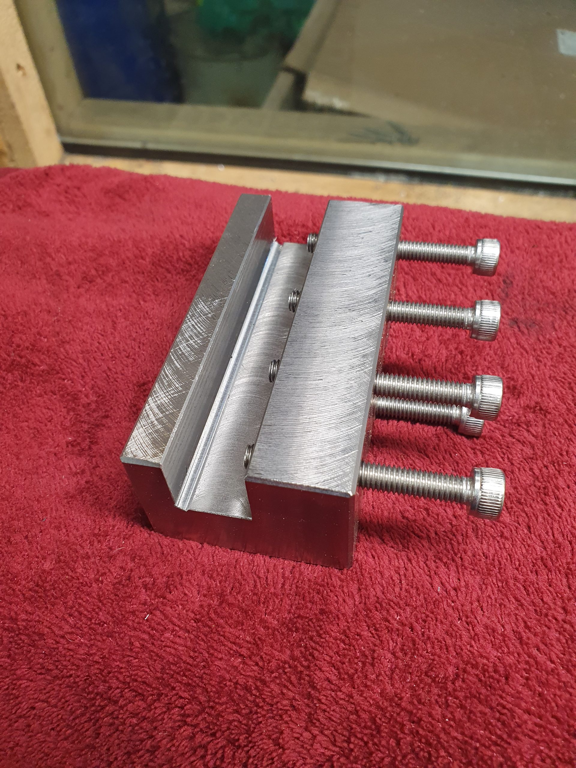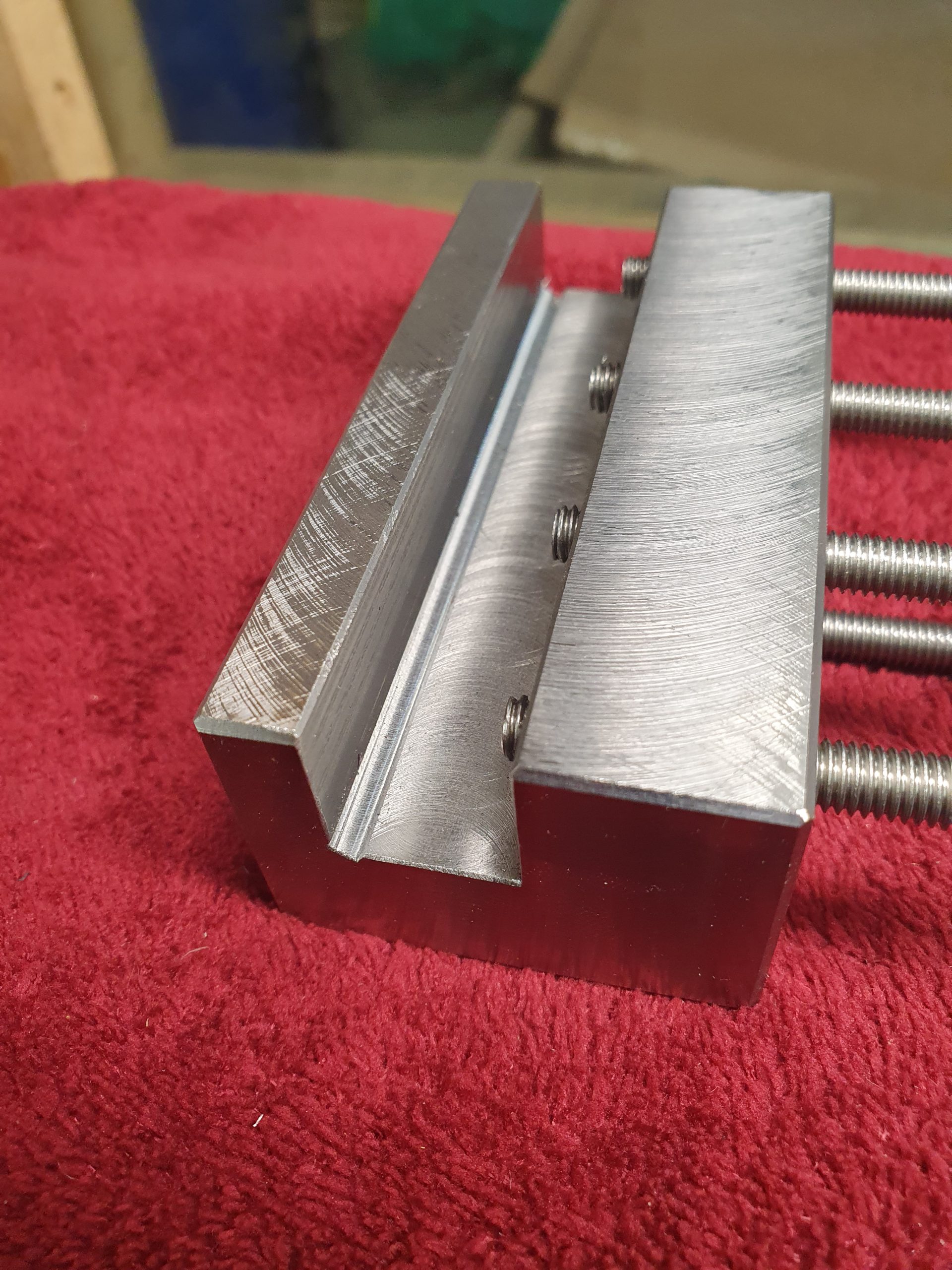 Aus einer großen Platte 1.2312 (40CrMnMoS8-6) Werkzeugstahl wurden auf der Bandsäge handlichere Blöcke gesägt. Die Vollnut war mit 16mm VHM-Fräser schnell erledigt.