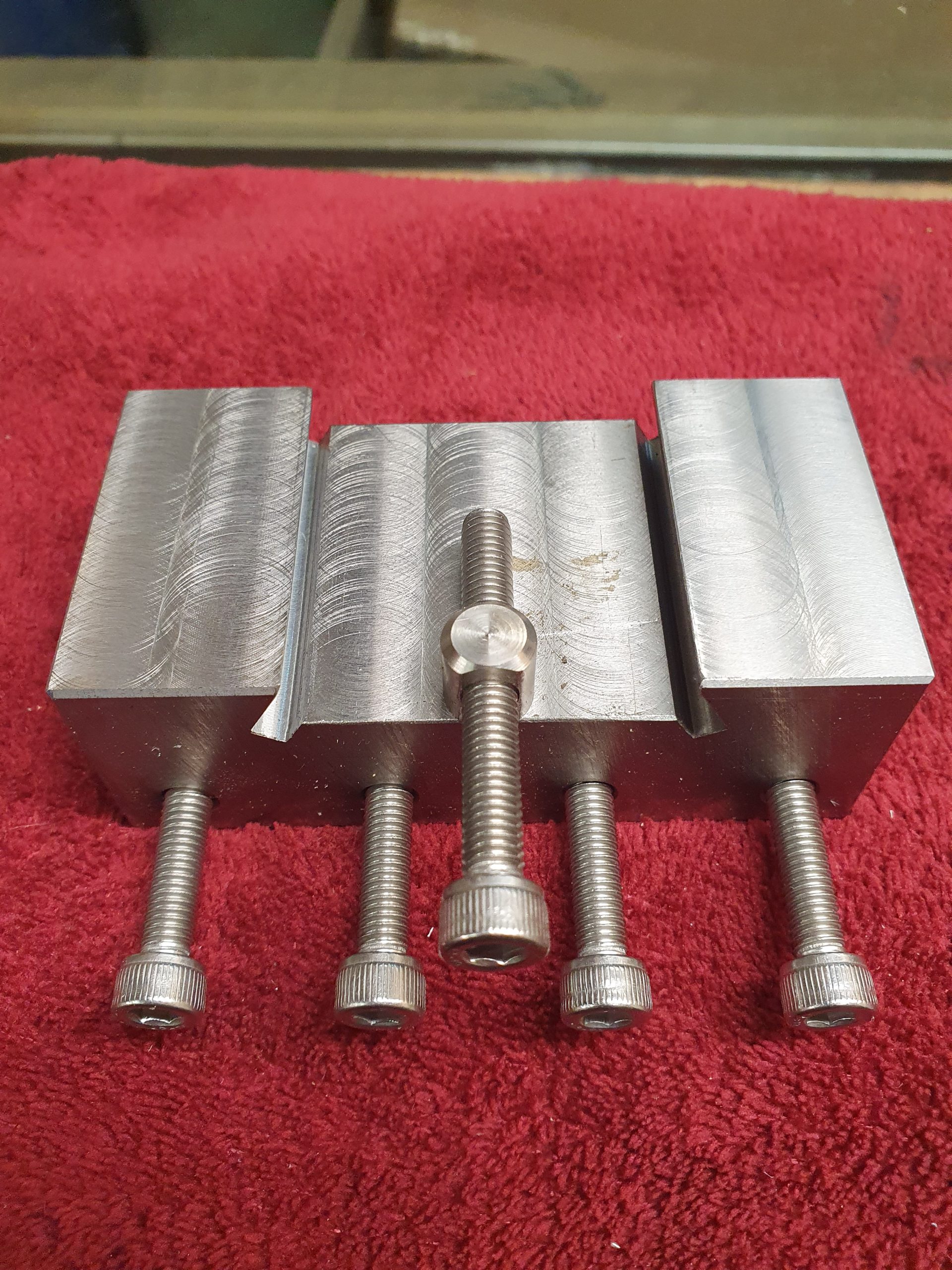 Für die Höhenverstellbarkeit haben wir aus 10mm Edelstahl Rundmaterial Schrauben mit übergroßem Kopf gedreht, abgefräst, gebohrt und mit Gewinde versehen und dann in korrekter Ausrichtung eingeklebt.