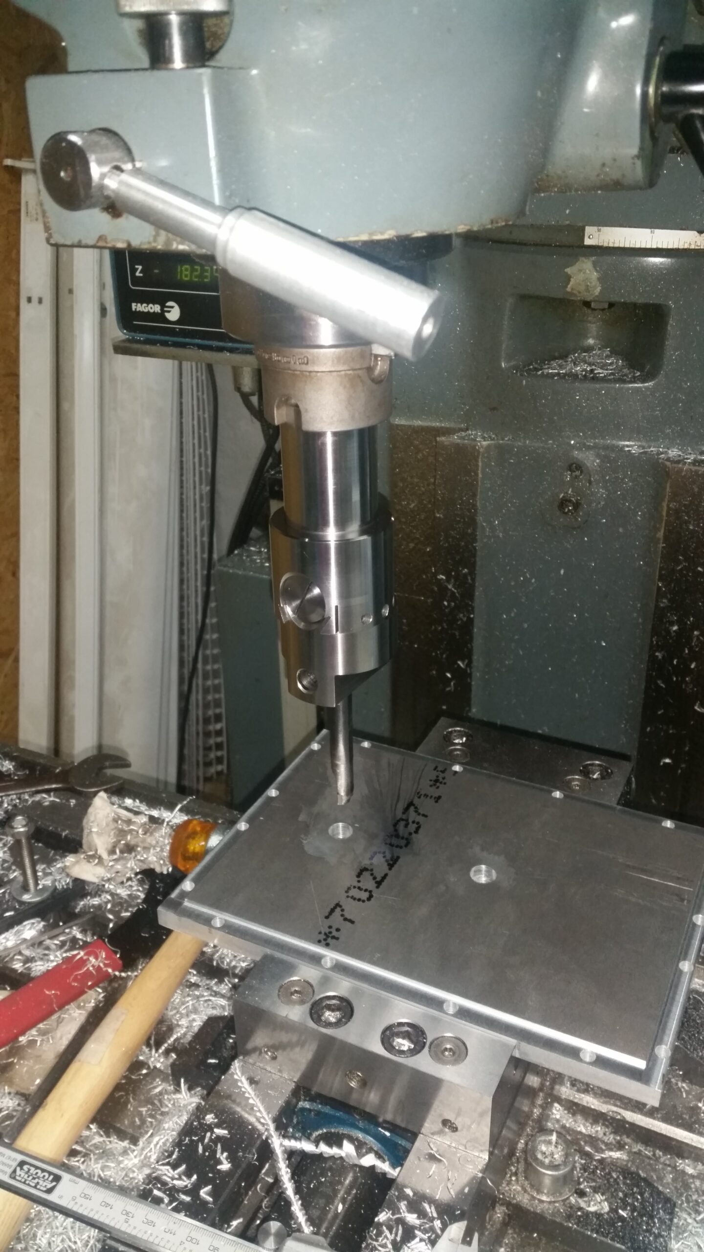 Als erstes Projekt wurde ein Platte aus AW-7075 Aluminium plangefräst und dann Sitze für Kugellager ausgespindelt: