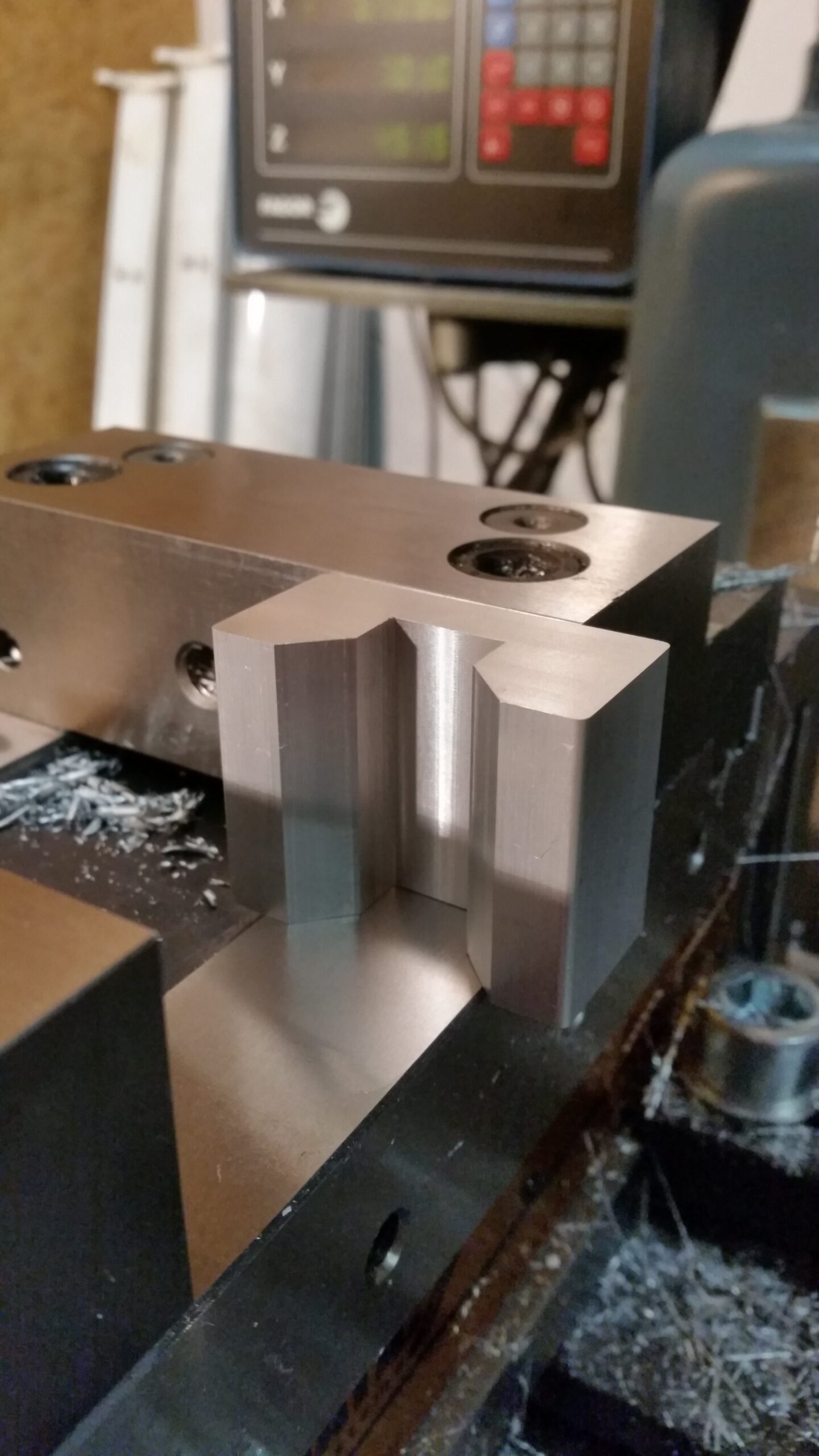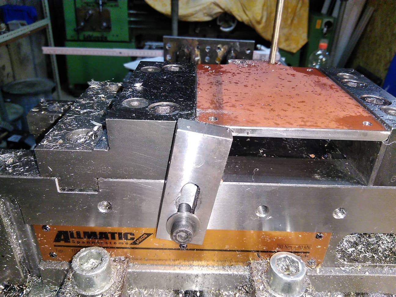 Für manche Arbeiten, die mehrfach ausgeführt werden müssen und man nicht jedes Mal erst einmal wieder einmessen möchte: Seitenanschläge sind in jeder Position mittels der Gewindebohrungen möglich! Hier als Beispiel Teile für unseren Eigenbau-Bandschleifer und dessen Y-Tisch – die Breite der Platten konnte hier wiederholbar gefräst werden.