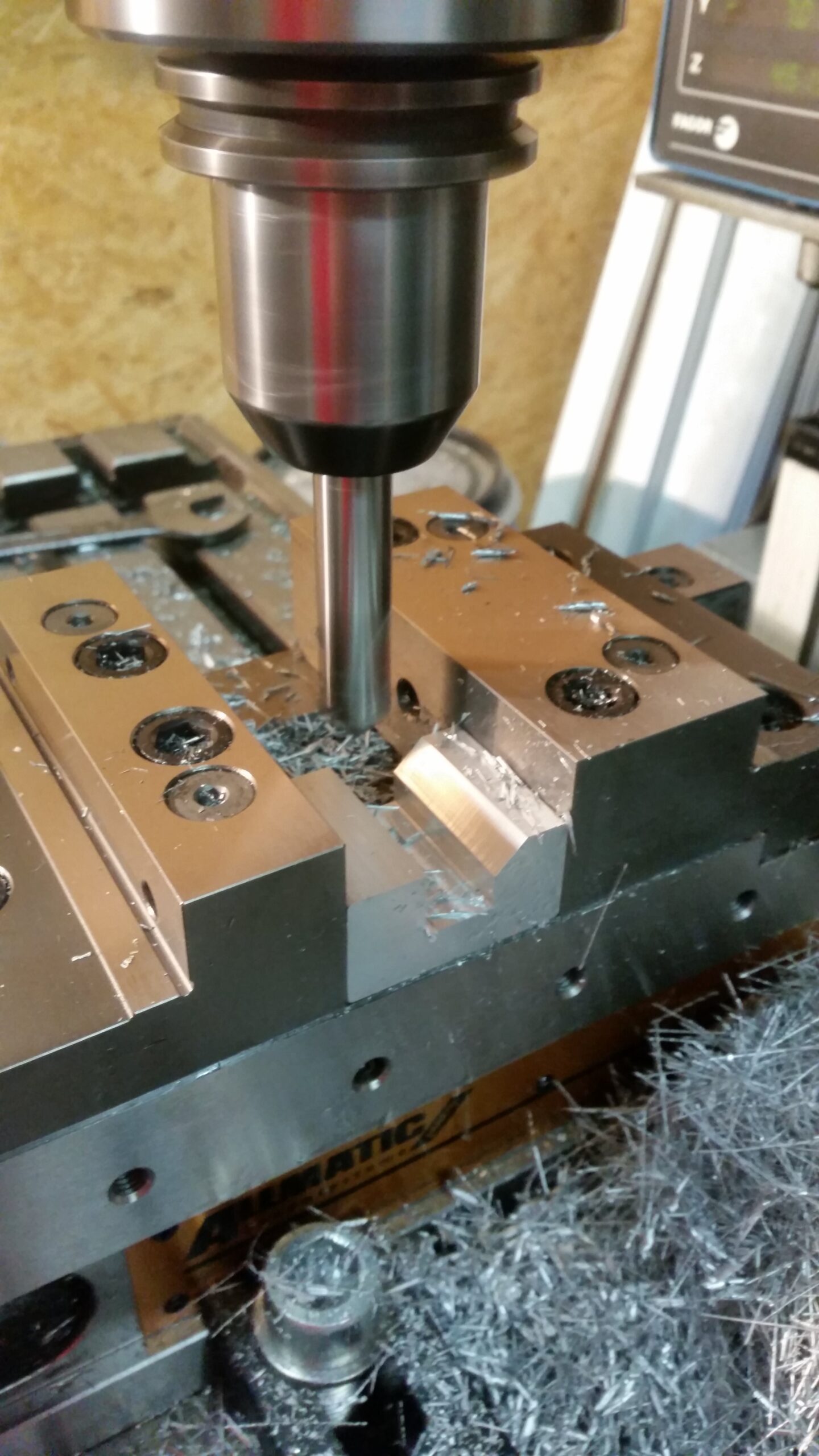 So haben wir direkt mal aus Aluminium-Reststücken zwei Soft-Jaws gefräst, um auch rundes Material halten zu können. Zuerst mit einem 16mm VHM Fräser Vollnut durch die Mitte und abschließend mit einem 16mm HSS 45° Fasenschneider noch die entstandenen Ecken angefast: