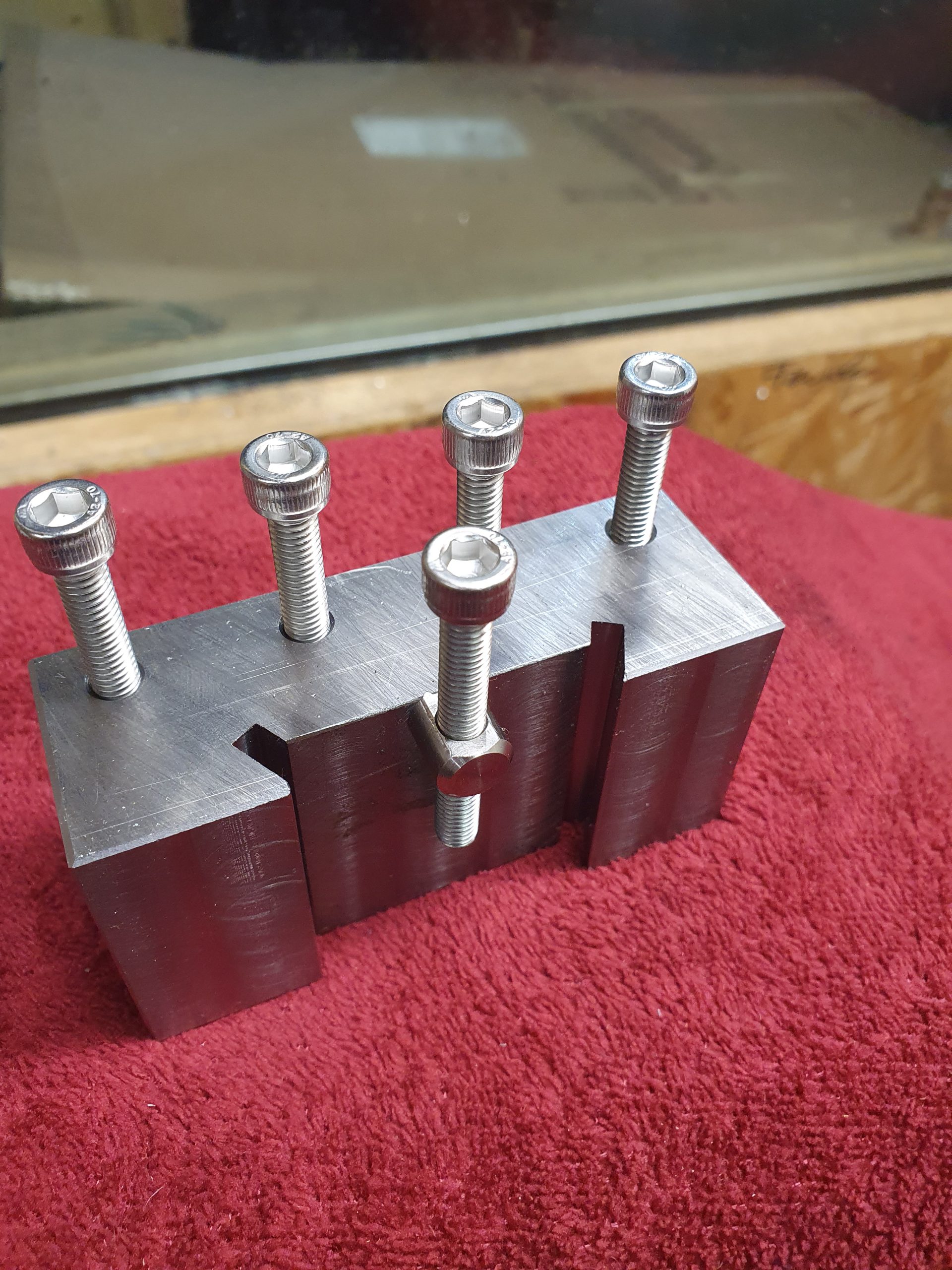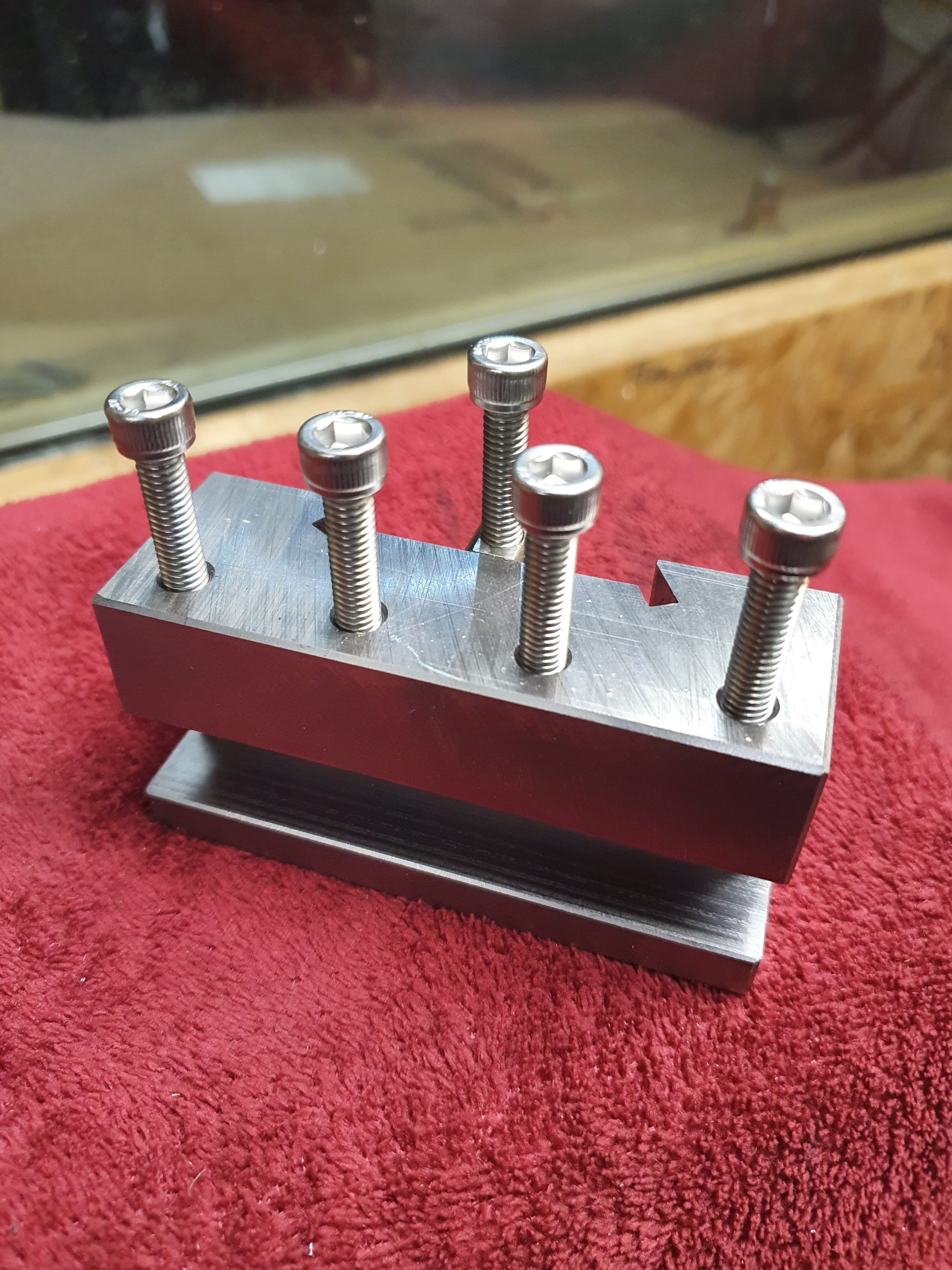 Aus einer großen Platte 1.2312 (40CrMnMoS8-6) Werkzeugstahl wurden auf der Bandsäge handlichere Blöcke gesägt. Die Vollnut war mit 16mm VHM-Fräser schnell erledigt.